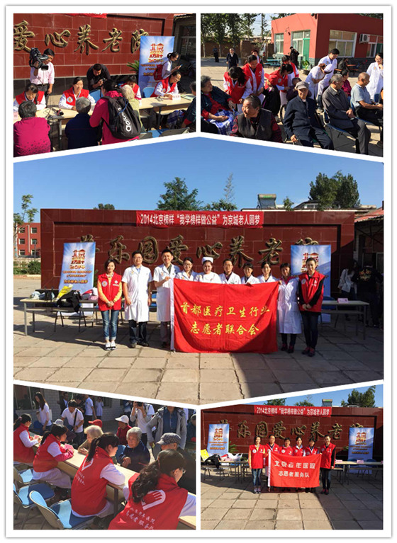 在重阳节来临之际,由院团委组织,作为北京市卫生计划生育委员会首都医疗卫生系统行业志愿者联合会的代表,于9月27日带领北京老年医院心内科樊燕琴、眼科吴香丽、消化科季红莉、骨一科韩晴等一行7人参加了此次活动。此次活动是由北京榜样组委会、首都文明办、北京市志愿服务联合会开展的大型主题志愿服务活动,以“我学榜样做公益”为口号,在北京长阳普乐园爱心养老院举行为京城老人进行义务健康义诊志愿服务活动。