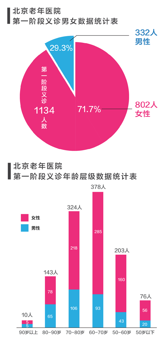 在活动第一阶段义诊的1134名村民中,男性332人,占比29.3%,女性802人,占比71.7%;90岁以上10人,占义诊总人数的0.9%,其中男性5人,女性5人;80岁以上至90岁以下的143人,占义诊总人数的12.6%,男性65人,女性78人;70岁以上80岁以下的324人,占义诊总人数的28.6%,男性106人,女性218人;60岁以上70岁以下的378人,占义诊总人数的33.3%,男性93人,女性285人;50岁以上60岁以下的203人,占义诊总人数的17.9%,男性43人,女性160人;50岁以下的76人,占义诊总人数的6.7%,男性20人,女性56人。人口老龄化、“空巢老人”居家养老等问题日益突出,村民的健康问题主要表现在高血压、心脑血管疾病、白内障、青光眼、耳鸣耳聋、肠胃疾病、骨科疾病等多种山区常见病、多发病。专家们希望通过开展专项健康宣教促进当地村民的健康意识,通过帮扶等形式提高乡镇卫生院的技术水平,使村民得到更好的医疗支撑。