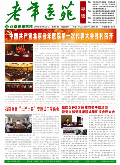 2016 年 3 月 25 日,北京老年医院召开 2016 年党务干部培训暨党支部党建课题成果汇报会评会,院领导、党支部书记和党支部委员、党务干部共计 50 余人参加了会议。会议由党委副书记张翠香主持。