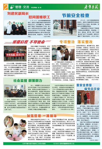 为了确保全院职工和患者度过一个欢乐、祥和、平安的新春佳节,2月11日院领导带领多个职能部门负责人,分三组对全院进行了一次节前安全、卫生专项治理联合大检查活动。