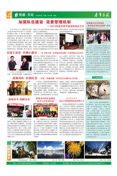 在深入开展党的群众路线教育实践活动中,院党委积极探索志愿服务新模式,提出“老年医疗专职志愿者”这一概念。曾被评为北京市“身边雷锋,最美北京人”的退休职工王玉琴成为首位“老年医疗专职志愿者”,将用她丰富的专业知识、临床经验和人生经历搭建起医生与患者的桥梁,更好地为患者服务;用她的志愿奉献精神带动更多的社会有识之士和离退休人员加入到“老年医疗专职志愿者”队伍。12月31日党委书记田喜慧代表院党委为王玉琴同志颁发“老年医疗专职志愿者”证书。
