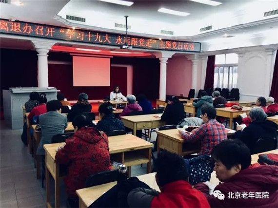为贯彻落实《北京老年医院党委关于学习宣传贯彻党的十九大精神的实施方案》要求,11月20日上午,离退休党支部在我院多功能厅召开“学习十九大 永远跟党走”主题党日活动。离退休党支部党员、群众共计70余人参加。