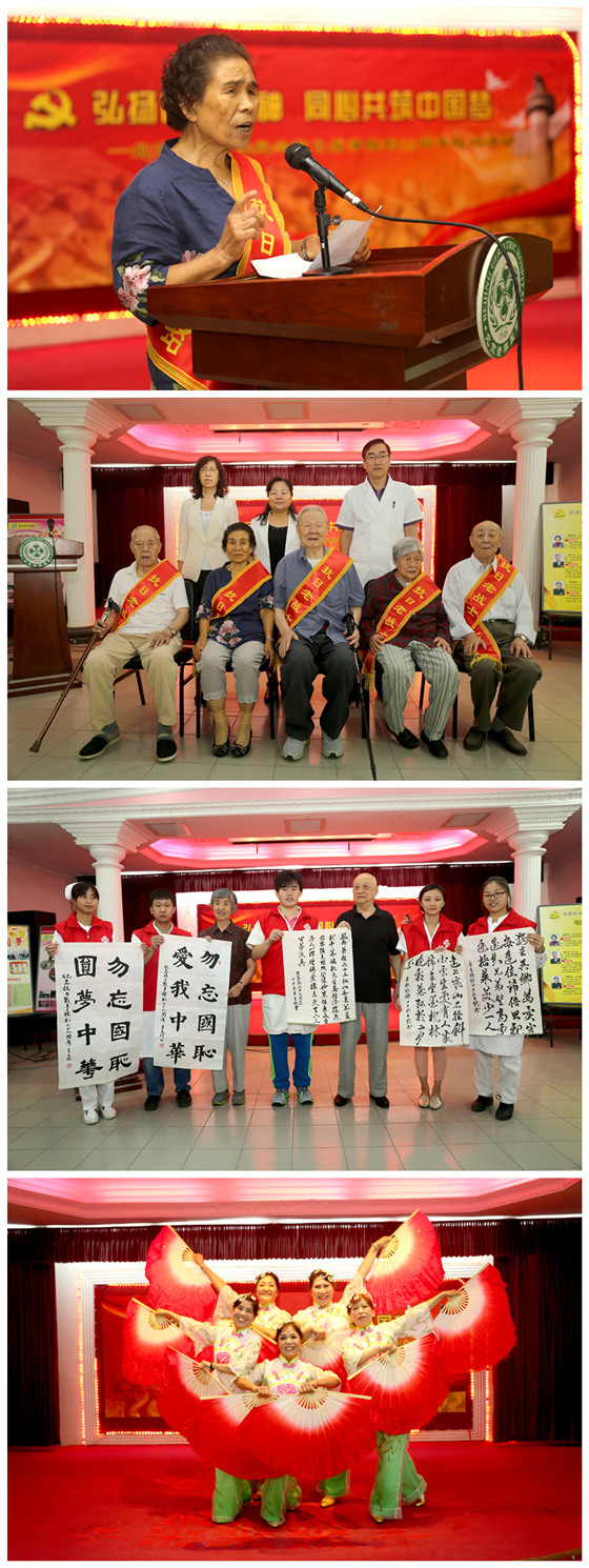纪念活动在纪录片《民族的记忆》中拉开序幕。隆隆的炮火,肆虐的铁蹄,悲伤的哭泣,愤怒的吼声……屏幕上的一幅幅历史画面,将所有人员带回到抗日战争的烽火岁月。当主持人宣布全体起立高唱国歌时,雄壮的歌声响彻整个会场,把纪念活动推向高潮。随后院党委书记田喜慧代表党委和全院干部职工向参会的老同志致以亲切的慰问和崇高的敬意!她说:“抚今追昔,我们倍感今天的幸福生活来之不易,倍感那些为了祖国和人民浴血奋战、英勇杀敌、保家卫国的抗日老战士的高尚精神值得我们学习和传承。我院现有5位抗日老战士,他们是我们医院的骄傲和光荣,更是我们医院宝贵的精神财富”。院长陈峥也向老同志们表达了敬意之情并通报了医院近期的发展和变化。离休干部魏淑琴同志代表抗日老战士发言,她说:“我先后经历了抗日、解放战争和抗美援朝,一直是把不当亡国奴、把日本鬼子赶出中国作为我的理想信念……”。她近十分钟的发言,每一字、每一句都流露出对党和人民的深厚感情。团员青年志愿者宋宇轩说:“我连续四年作为助老爱老的志愿者,参加了团委和离退办组织的各项活动,今天很受鼓舞,我要学习和发扬老一辈的优良传统,从思想和行动上承担起新时期的历史使命,不辜负党的期望和老一辈的嘱托。”最后老干部还向团员青年志愿者赠送了“勿忘国耻、圆梦中华”部分书法作品。退休职工舞蹈队表演了精彩的节目。