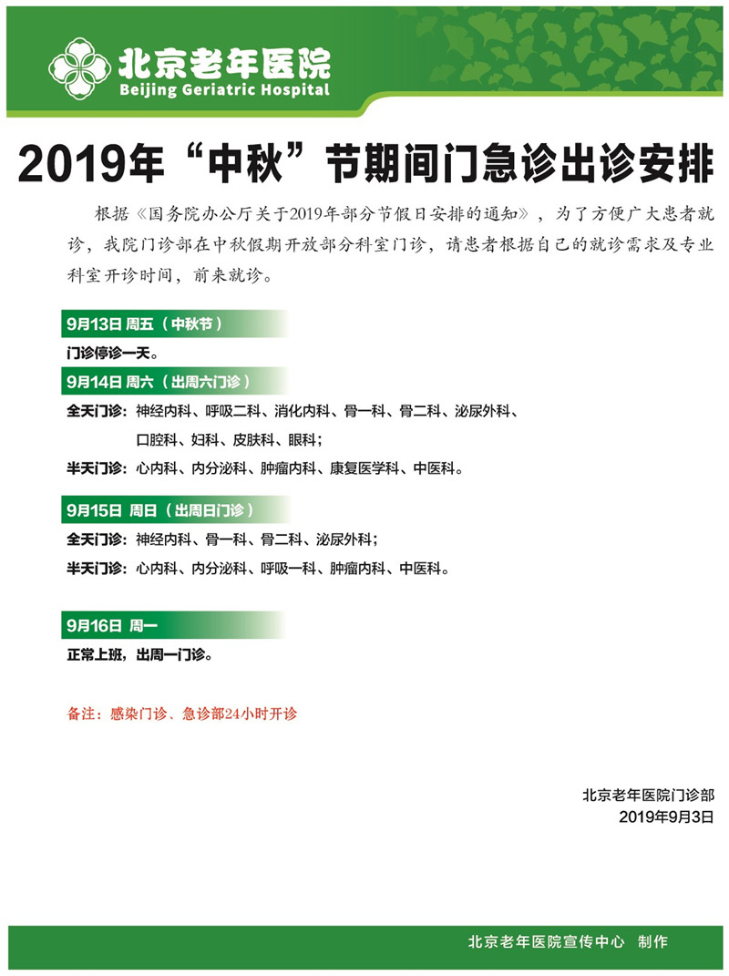 2019年“中秋”节期间门急诊出诊安排