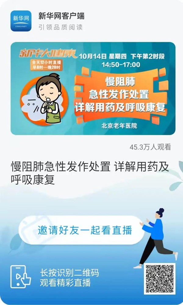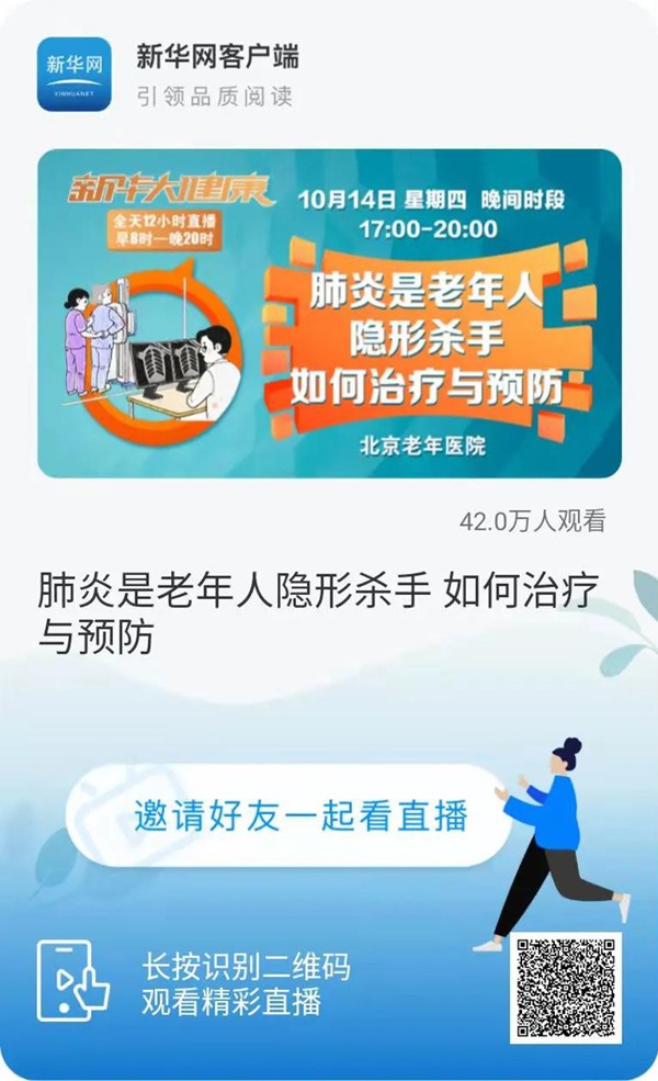 2021年10月14日是中国民间传统节日“重阳节”,也是“老人节”。为大力弘扬中华民族敬老爱老的传统美德,不断提高老年人自我保健意识,普及健康知识,帮助老年人做到疾病的早发现早诊断早治疗,提高老年人的生活质量和幸福指数,北京老年医院联合国家级健康直播平台新华网《新华大健康》节目,从10月11日至10月15日,开展连续5天,每天12小时的健康科普直播活动。
