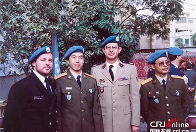 △1990年4月,中国首次向联合国停战监督组织派出的军事观察员,庞延东少校(左二)、徐进先少校(右一)
