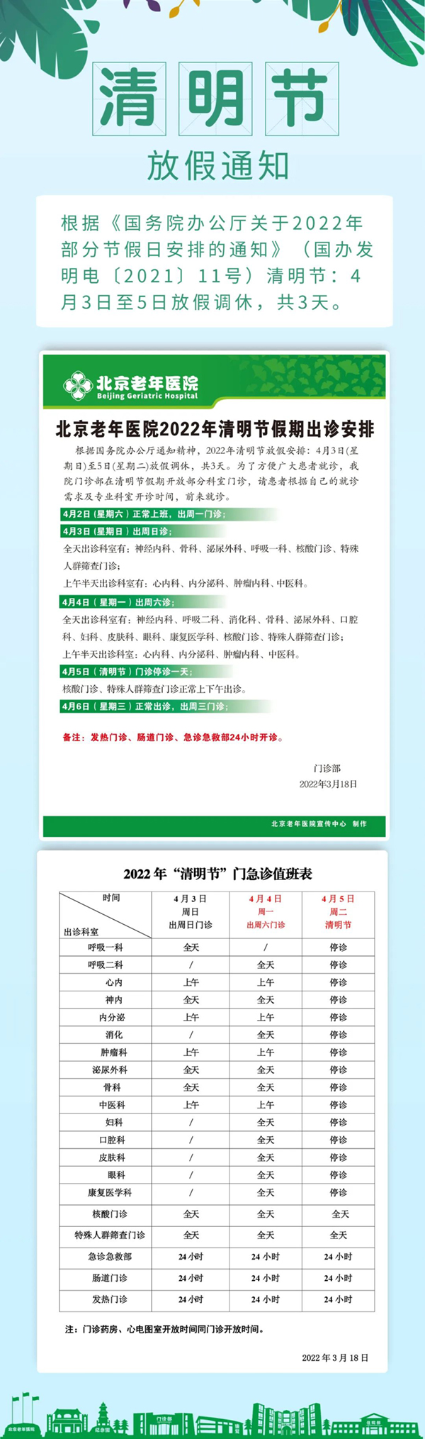 北京老年医院2022年“清明节”门急诊出诊安排