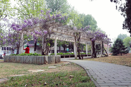 往 以前的紫藤长廊白色的柱子上随着岁月的流逝有了泛黄的印记和裂纹。