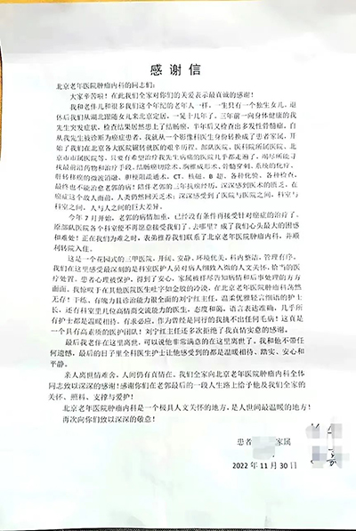 近日,北京老年医院肿瘤内科刘宁红主任收到一封由患者家属写的感谢信,家属强烈要求将这封反复修改的感谢信刊登在医院的微信公众号上,不仅想表达不尽的感激之情,更想通过这封感谢信呼吁生命最后一程的人文关怀。