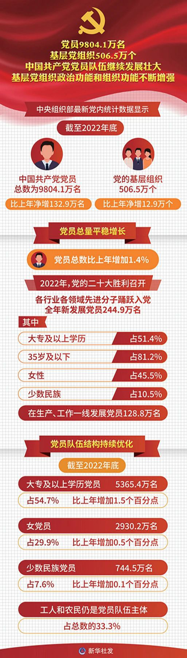 中央组织部最新党内统计数据显示,截至2022年底,中国共产党党员总数为9804.1万名,比上年净增132.9万名。党的基层组织506.5万个,比上年净增12.9万个。历经百年风雨和新时代10年革命性锻造,中国共产党更加坚强有力、更加充满活力,党的组织体系日益严密,党的执政根基不断巩固。