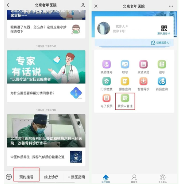 微信搜索“北京老年医院”公众号并关注,点击预约挂号,首次使用未添加就诊人的患者请点击右下角“个人中心”-“添加就诊人”在线建卡(医保患者首次到我院就诊需要在2、3号窗口完善个人信息)。
