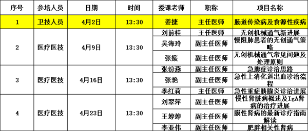 2025年4月份区县级继教项目时间安排培训见上表。培训地点:老年医院学术报告厅 如课程安排有变化请关注官网