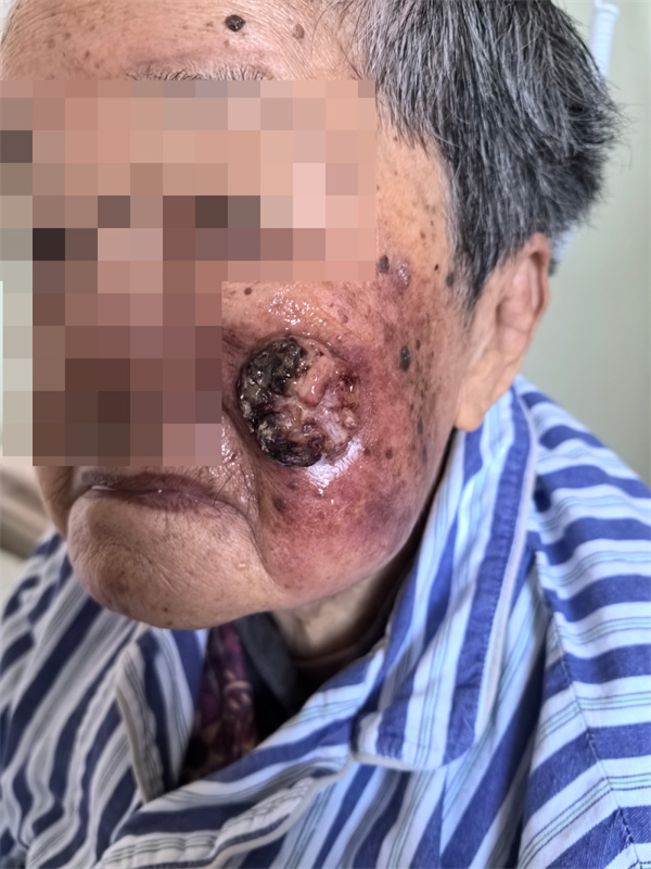 2024年6月,王奶奶无意中发现左侧面部出现一颗褐色小结节,初如黄豆大小,外用药治疗后未见好转。随后的三个月内,结节迅速增大至蚕豆大小,并伴有局部出血。9月23日,王奶奶前往北京老年医院皮肤性病科就诊,经活检病理确诊为低分化鳞状细胞癌(T2bN0M0 II期),此时左脸结节已经长成2*3cm的肿物。