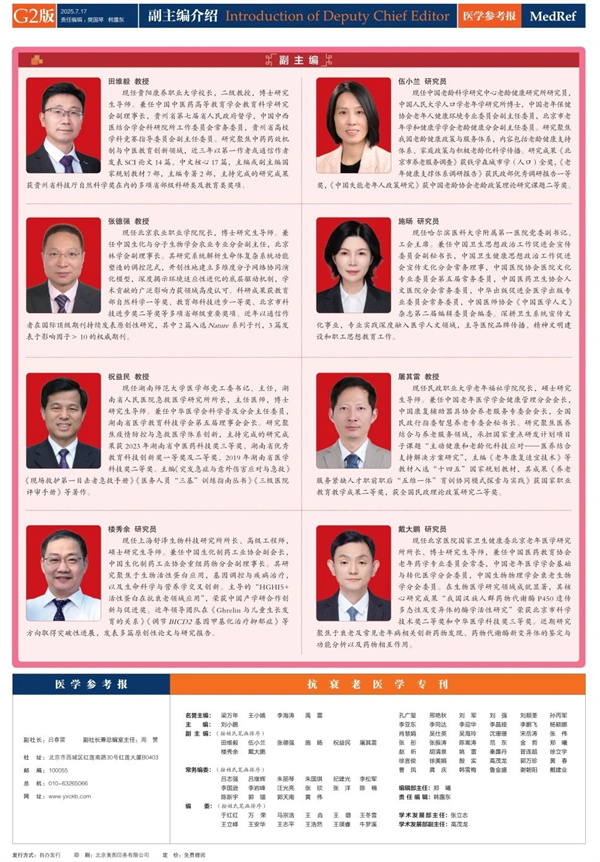 由国家新闻出版署审批,中宣部严格监管,国家卫生健康委员会主管的国家级医药卫生学术期刊《医学参考报》,携手北京老年医院共同创办的《医学参考报抗衰老医学专刊》于2025年8月隆重推出首刊(首期完整版内容请见下图)。