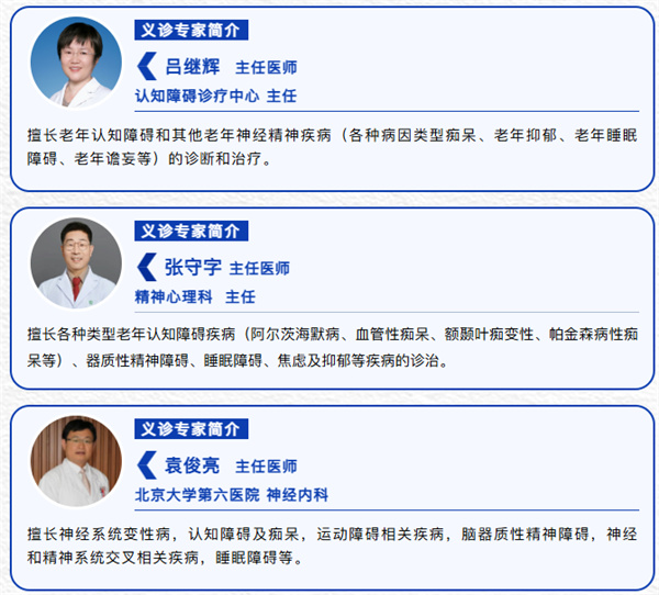 9月17日(周三)上午8:30-11:00,北京老年医院认知障碍诊疗中心将组建专家团队,为长辈们开展 阿尔茨海默病 科普宣讲 和 义诊咨询,守护长辈们的脑健康!