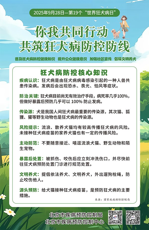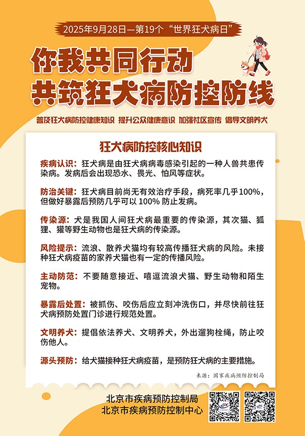 2025年9月28日是第19个“世界狂犬病日”,按照《国家疾控局综合司关于组织开展2025年世界狂犬病日宣传活动的通知 》(国疾控综传防函〔2025〕236号)要求,为进一步做好狂犬病 防治宣传工作,提升狂犬病防控意识,我院疾控处围绕今年我国“世界狂犬病日”的宣传主题是“你我共同行动, 共筑狂犬病防控防线”,狂犬病暴露预防处置门诊医生对就诊患者加强针对性宣传,提升宣传效果,同时动员全院职工及来诊患者及家属参与宣传活动,积极配合相关部门开展社区宣传和文明养犬宣传活动,进一步扩大宣传影响力。认真学习狂犬病防控核心知识,从你我做起, 从身边做起,筑起防控狂犬病的社区防线,将狂犬病疫情持续控制在低流行水平。