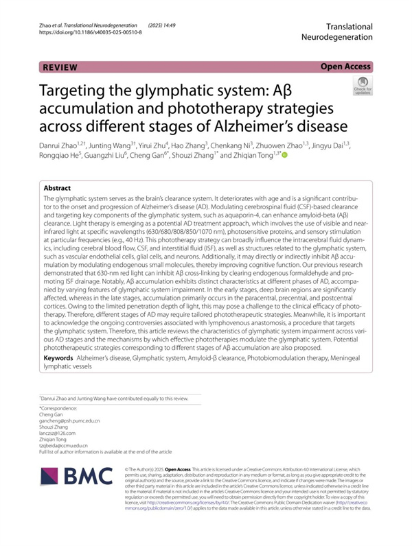 2025年9月24日,童志前课题组联合我院认知障碍诊疗中心张守字主任在转化医学期刊Translational Neurodegeneration(IF=15.2,JCR1区,中科院1区)发表题为《靶向类淋巴系统:阿尔茨海默病不同阶段的Aβ积累与光疗策略》的论文。