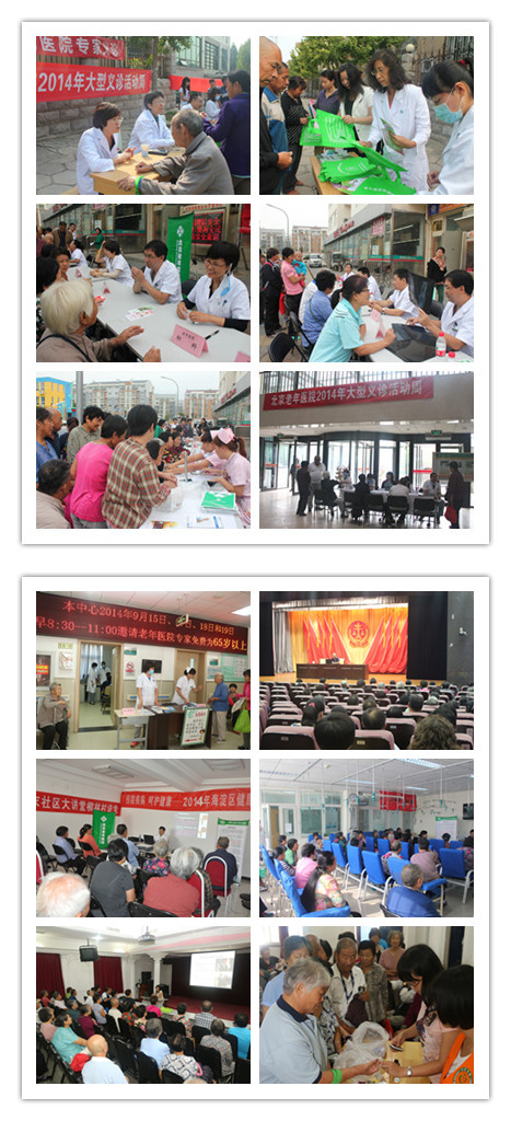 根据《2014年北京老年医院大型义诊活动周工作方案》,为提高广大群众的健康意识,让居民不用出门就能享受到医院优质的医疗服务,在刚刚过去的义诊周里,北京老年医院走进机关社区、走进村镇、走进对口支援医疗机构,开展了形式多样、丰富多彩的义诊和健康讲座活动。